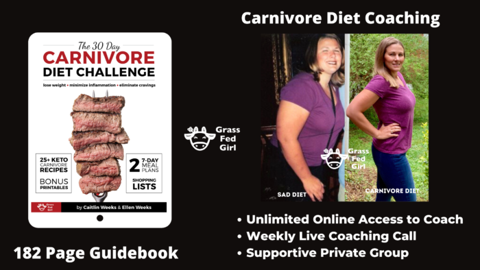 Disclaimer: The 30 Day Carnivore Diet Challenge and Coaching Group is for informational purposes only and does not constitute medical advice; the content is not intended to be a substitute for professional medical advice, diagnosis, or treatment. Always seek the advice of a physician or other qualified health provider with any questions regarding a medical condition. Never disregard professional +medical advice or delay in seeking it because of something you have read in this program. Also be sure to ask your doctor before starting any nutrition or exercise program. Caitlin Weeks and Ellen Weeks do not recommend or endorse any specific tests, physicians, products, procedures, opinions, or other information in this program. Reliance on any information provided by this book is solely at your own risk.